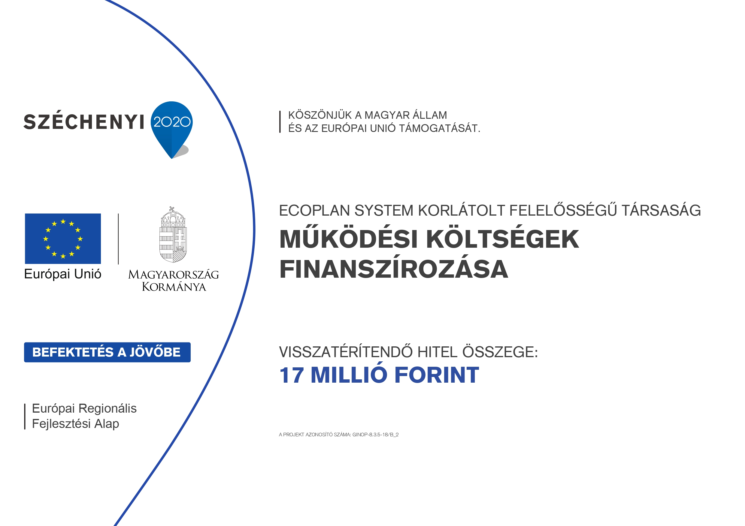 - az Adós neve: EcoPlan System Korlátolt Felelősségű Társaság - a Forgóeszköz finanszírozás tartalmának rövid bemutatása: Működési költségek finanszírozása - a Hitelprogram azonosító jele: GINOP-8.3.5-18/B_2